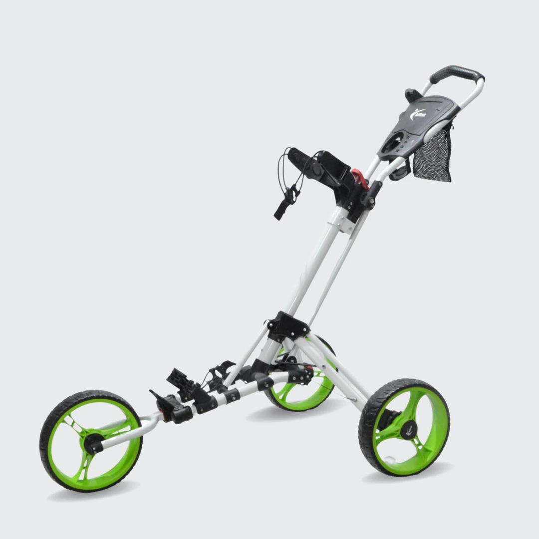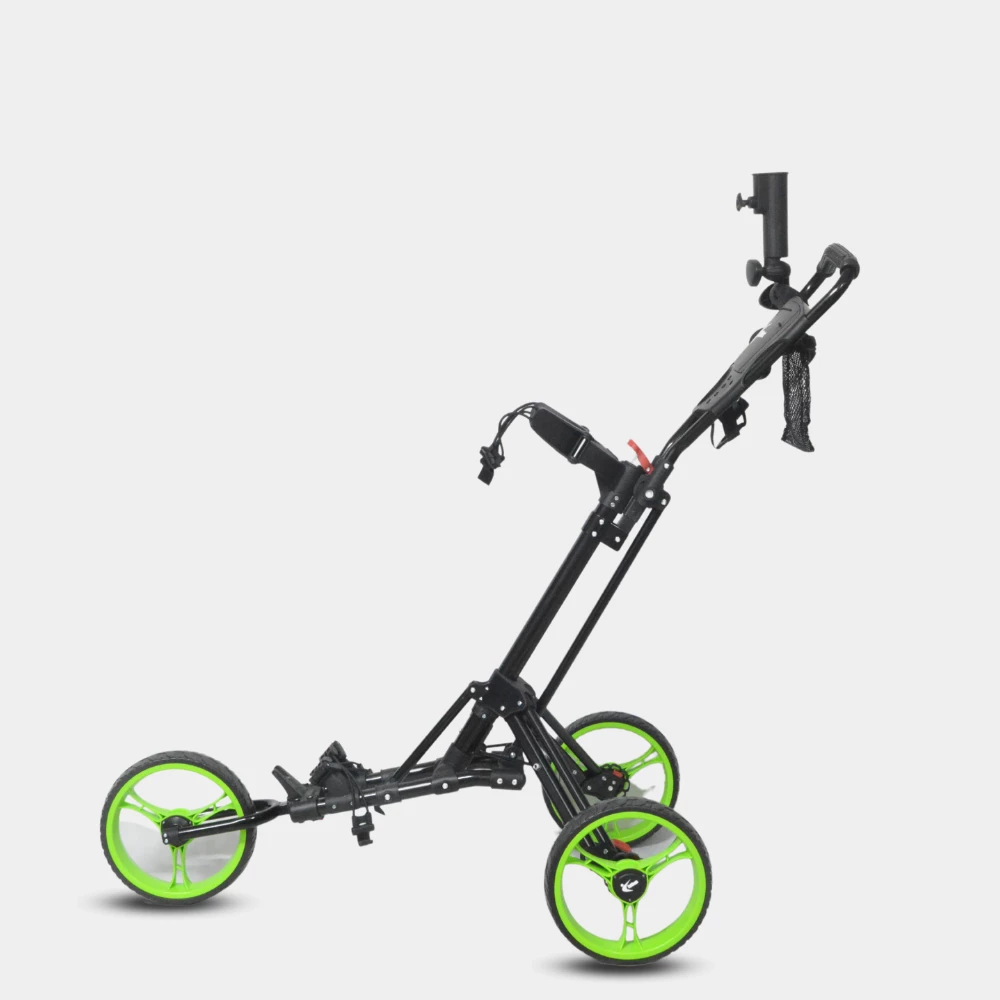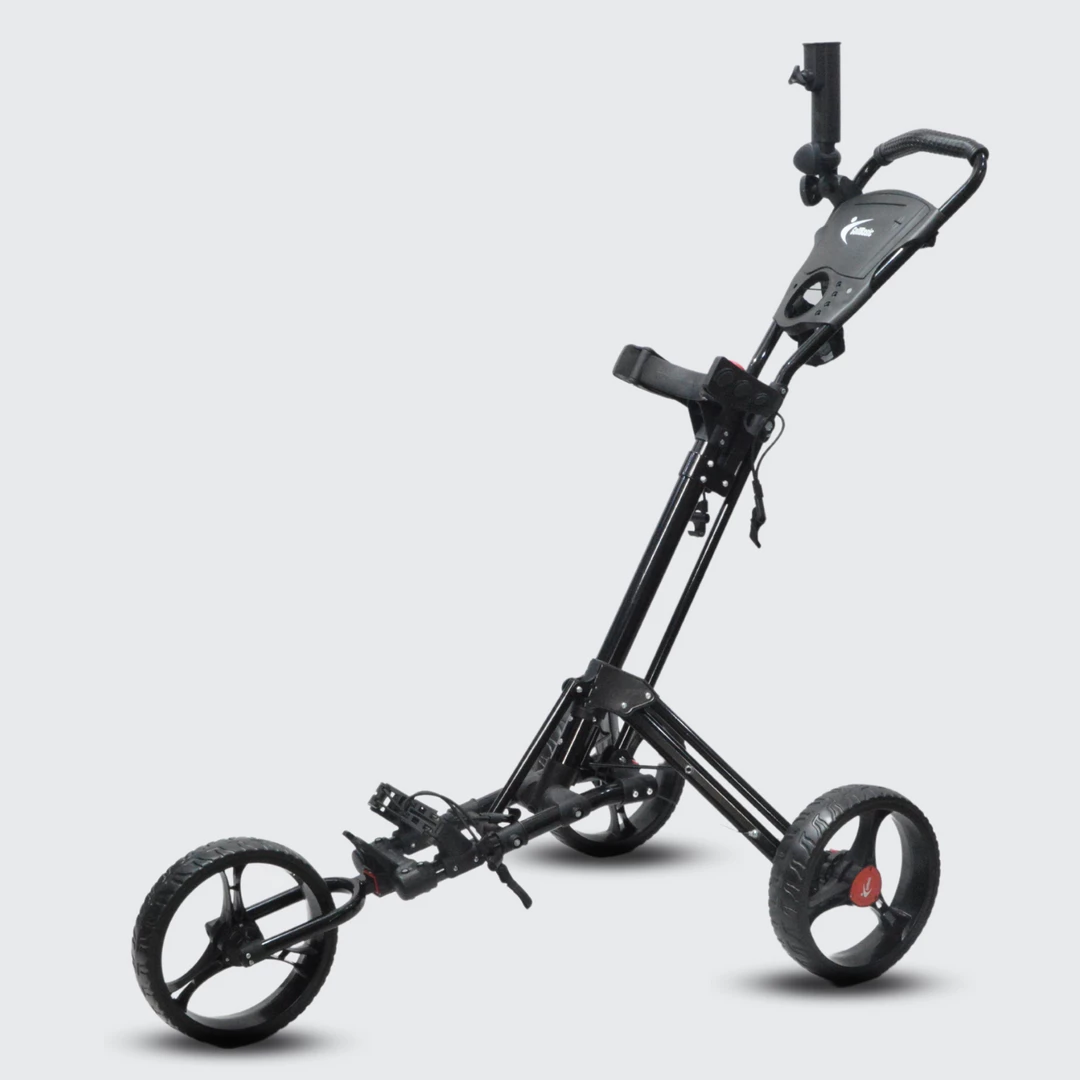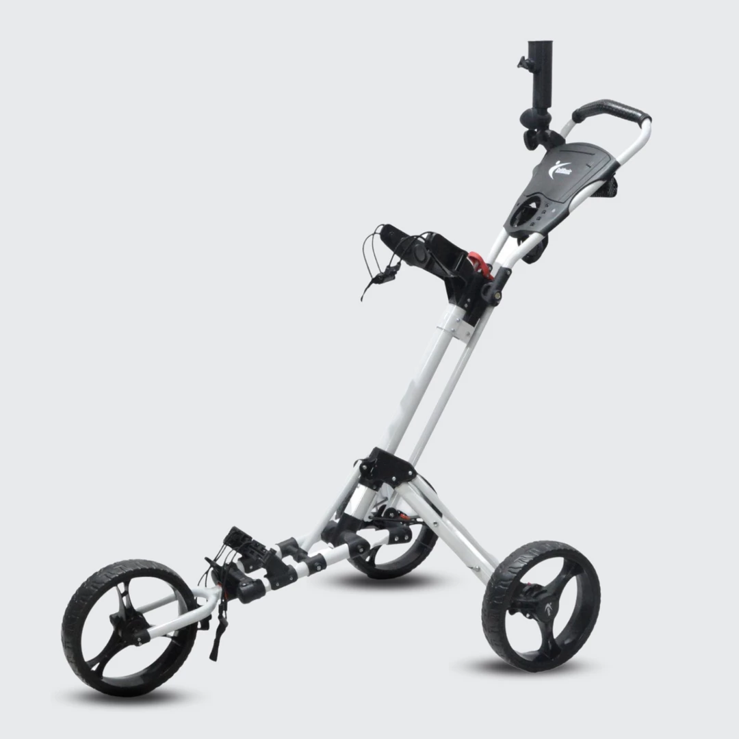 The GolfBasicย Caddylite V-Techย folds and unfolds easy and you can even attach your golf bag while itโs folded. Accessories include an umbrella holder and beverage holder.